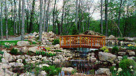The second set of cascading water is directly under the bridge. It can be controlled by a dam as well as electronically by remote control. The lower basin can be turned off since it is only the upper one that has fish. The lower basin is left to self populate naturally and contains most of the plant material.