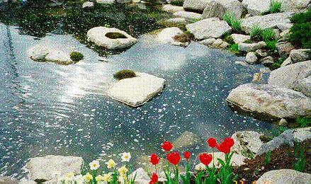As you can see the lower pond has many rocks and natural features. The perimeter planting is obviously not natural but still adds some colour and beauty to the overall landscaping.